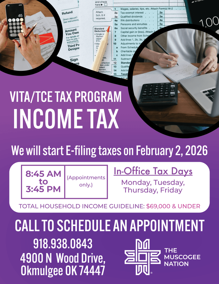 MUSCOGEE NATION, OK, JAN 7 — The Muscogee Nation Tax Commission will be offering VITA/TCE assistance, starting February 2, 2026. The Volunteer Income Tax Assistance (VITA) and Tax Counseling for the Elderly (TCE) programs offer free basic tax return preparation to qualified individuals. VITA sites offer free tax help to people who need assistance in preparing their own tax returns. The TCE program offers free tax help, particularly for those who are 60 years of age and older, specializing in questions about pensions and retirement-related issues unique to seniors.