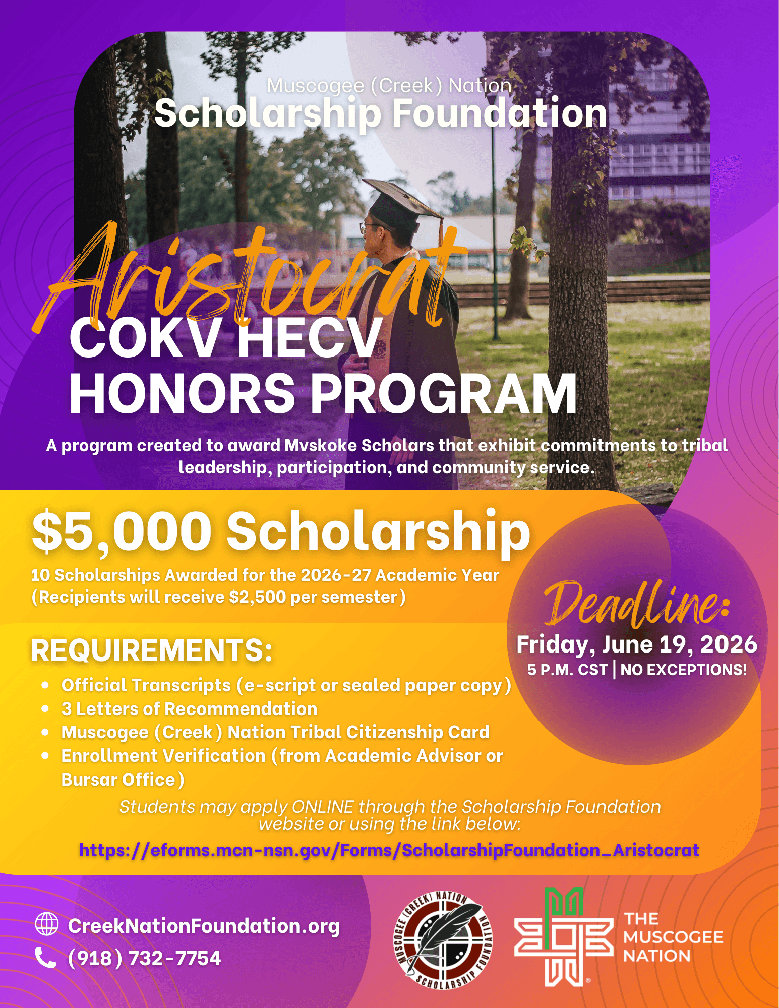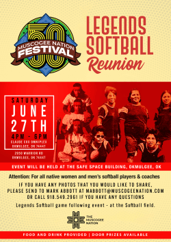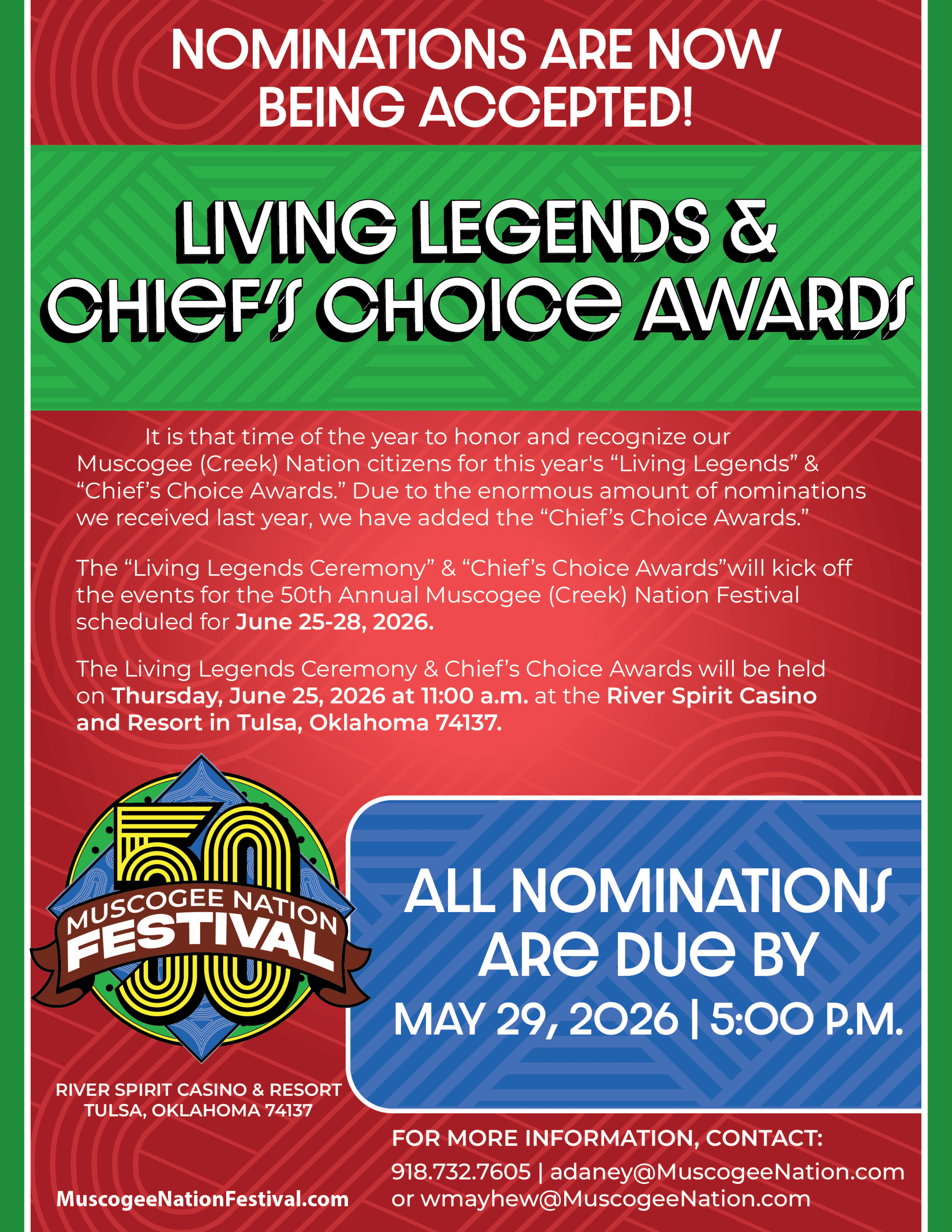 The Living Legends/Chief’s Choice Award Ceremony will kick off the events for the 50th Annual Muscogee (Creek) Nation Festival scheduled for June 25-28, 2026.